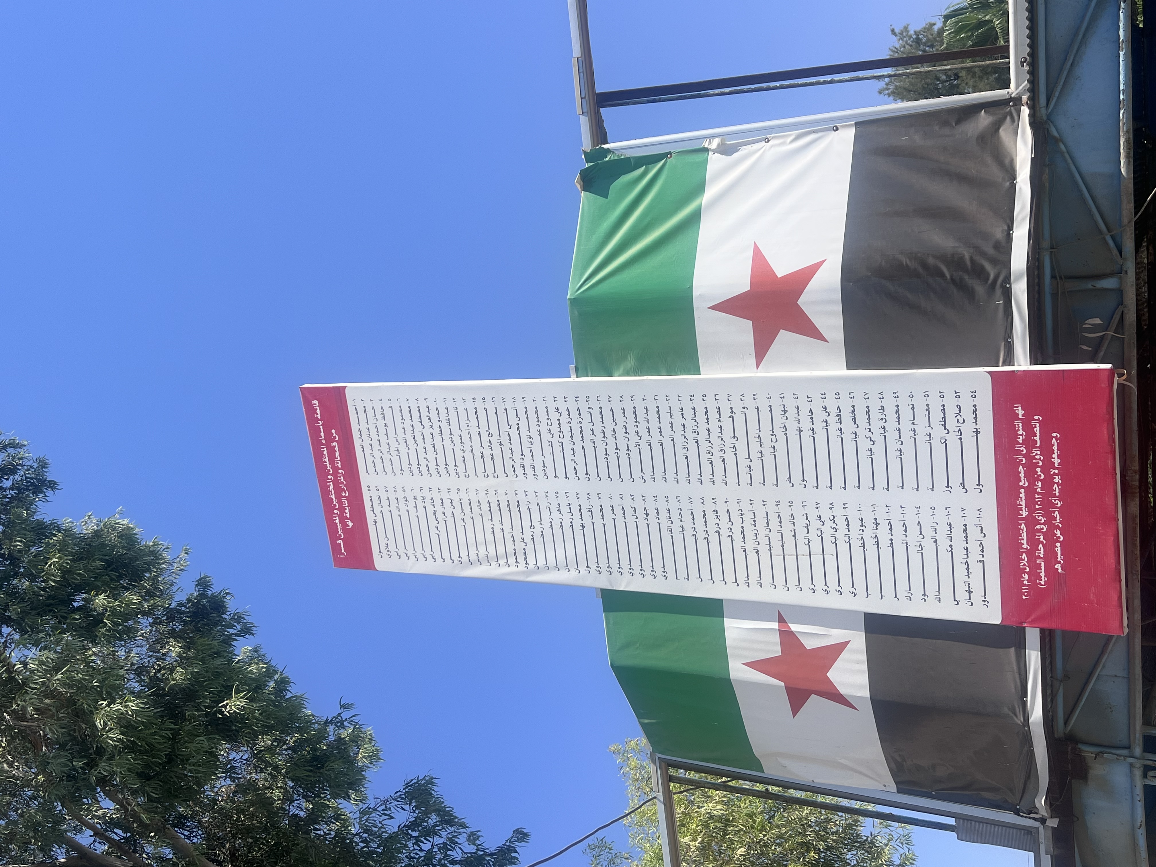 وعلى الرغم من أنّ قمحانة ما زالت تحمل سمعةً واسعة باعتبارها «بلدة الشبيحة»، فإنّ معارضين ومُكوِّعين على حدّ سواء بذلوا جهداً كبيراً لإعادة رسم صورتها. فمع أنّ المرء لا يزال يعثر على قبور «شهداء» قاتلوا في صفوف النظام وقواته، باتت تُشاهَد اليوم أيضاً جدارياتٌ تحمل علم سوريا الجديد، وتستعيد ذكرى يوم «تحرير» قمحانة في 5 كانون الأول/ ديسمبر 2024. وعلى امتداد أحد الطرق الرئيسية، تُعلَّق لافتةٌ كبيرة تسرد أسماء 108 أشخاص من قمحانة ومحيطها، كانوا قد تعرّضوا للاعتقال أو الاحتجاز أو الإخفاء القسري على يد النظام بين عام 2011 والنصف الأول من عام 2012.