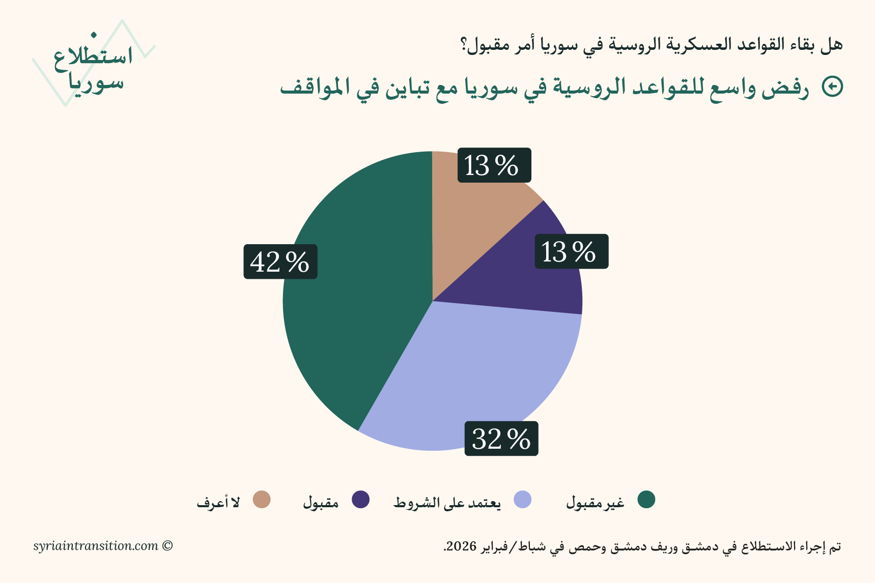 3. أثار استمرار وجود القواعد العسكرية الروسية في سوريا مواقف متباينة بين المستجيبين. فقد رأى 42 في المئة أنه أمر غير مقبول إطلاقاً، بينما تبنّى 32 في المئة موقفاً أكثر براغماتية، معتبرين أن ذلك يعتمد على الشروط والظروف. في المقابل، اعتبر 13 في المئة فقط أن هذا الوجود مقبول بشكل عام.