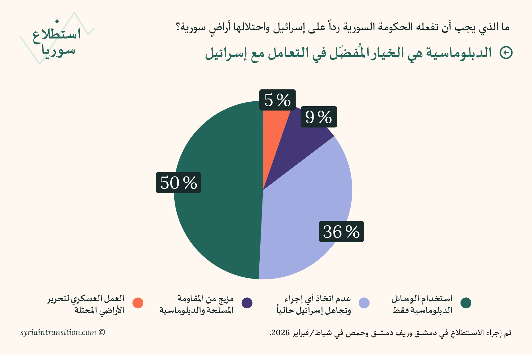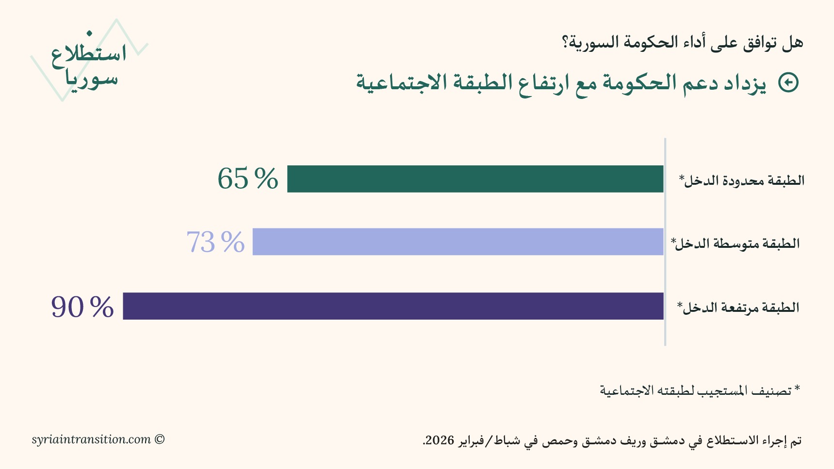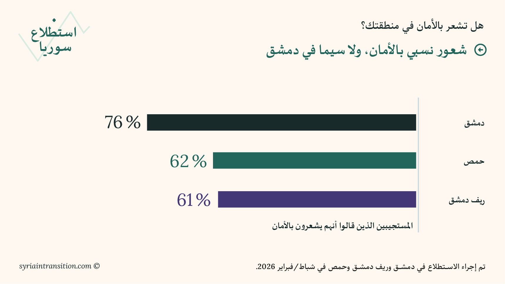 مرحبًا بكم في العدد الأول من استطلاع سوريا. يعرض هذا العدد الافتتاحي نتائج استبيانات أُجريت في دمشق وريف دمشق وحمص في أوائل شباط/ فبراير 2026، بهدف قياس تقييم السكان لظروفهم المعيشية، وأداء الحكومة، والتطورات السياسية الأخيرة.