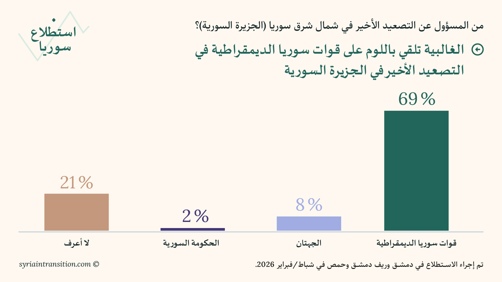 1. شهد العام الجاري توتراً مبكراً، مع تصاعد الصراع وتكثّف المفاوضات بين الحكومة في دمشق وقوات سوريا الديمقراطية. وبين المستجيبين يبرز اتجاه واضح يتمثل في تحميل قوات سوريا الديمقراطية مسؤولية التصعيد الأخير. فقد اعتبر 69 في المئة أن المسؤولية تقع على عاتق هذه القوات، في حين لم ينسب سوى 2 في المئة المسؤولية إلى الحكومة في دمشق.